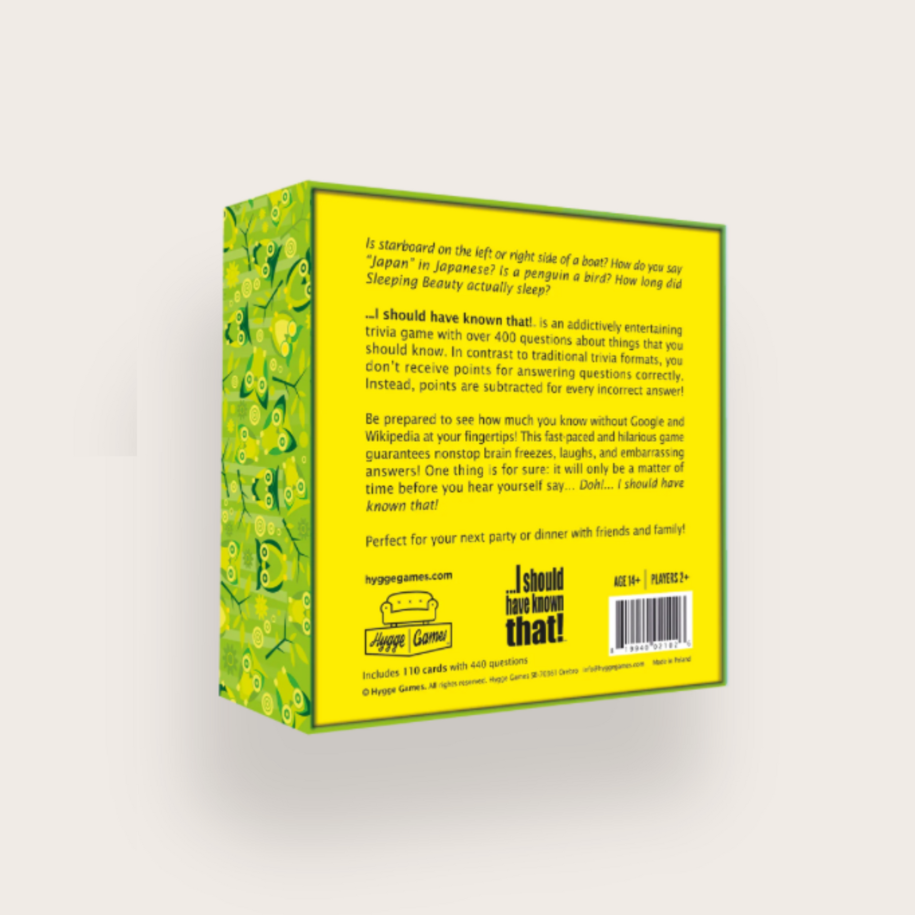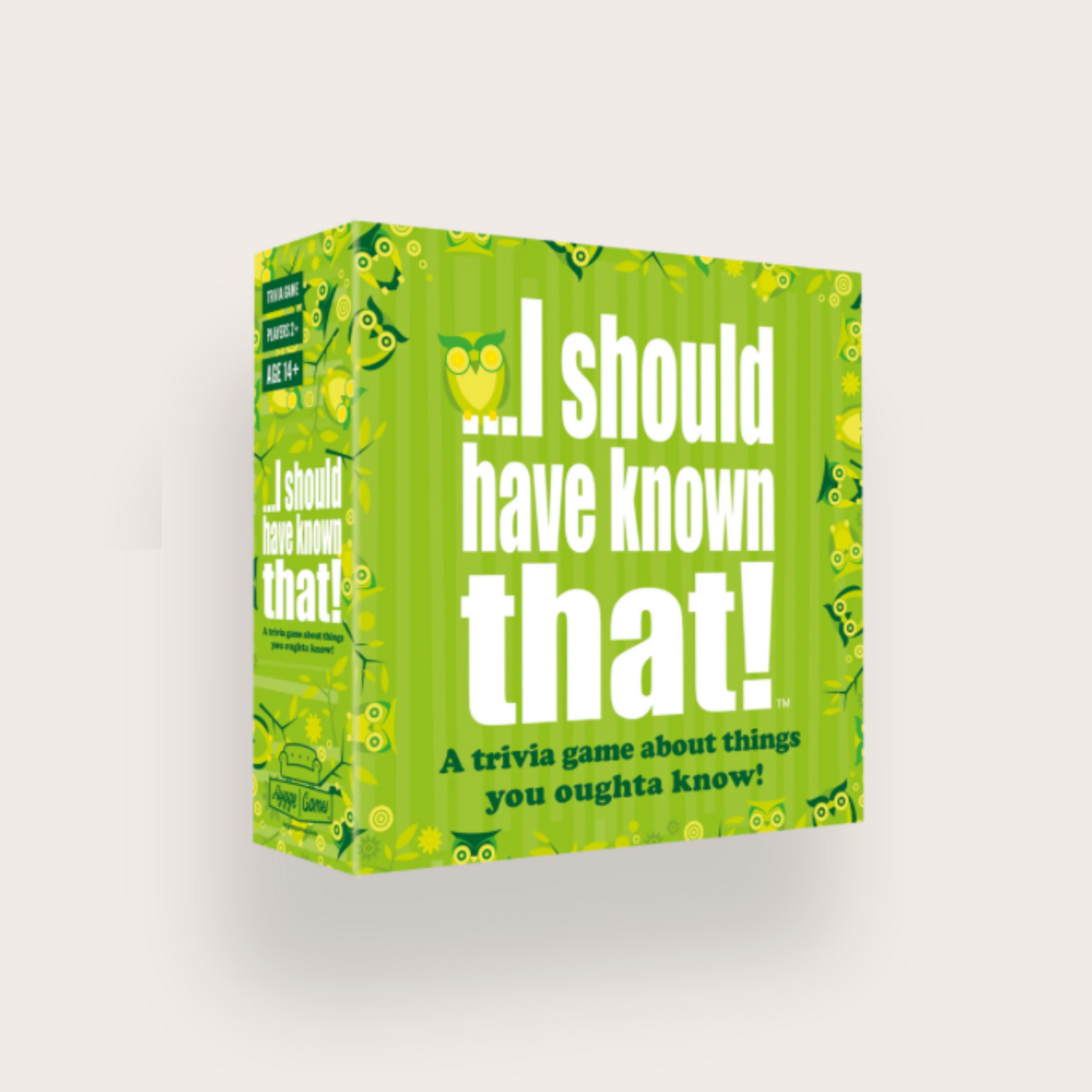 ...I should have known that! is an addictively entertaining trivia game with over 400 questions about things that you should know. In contrast to traditional trivia formats, you don’t receive points for answering questions correctly. Instead, points are subtracted for every incorrect answer!