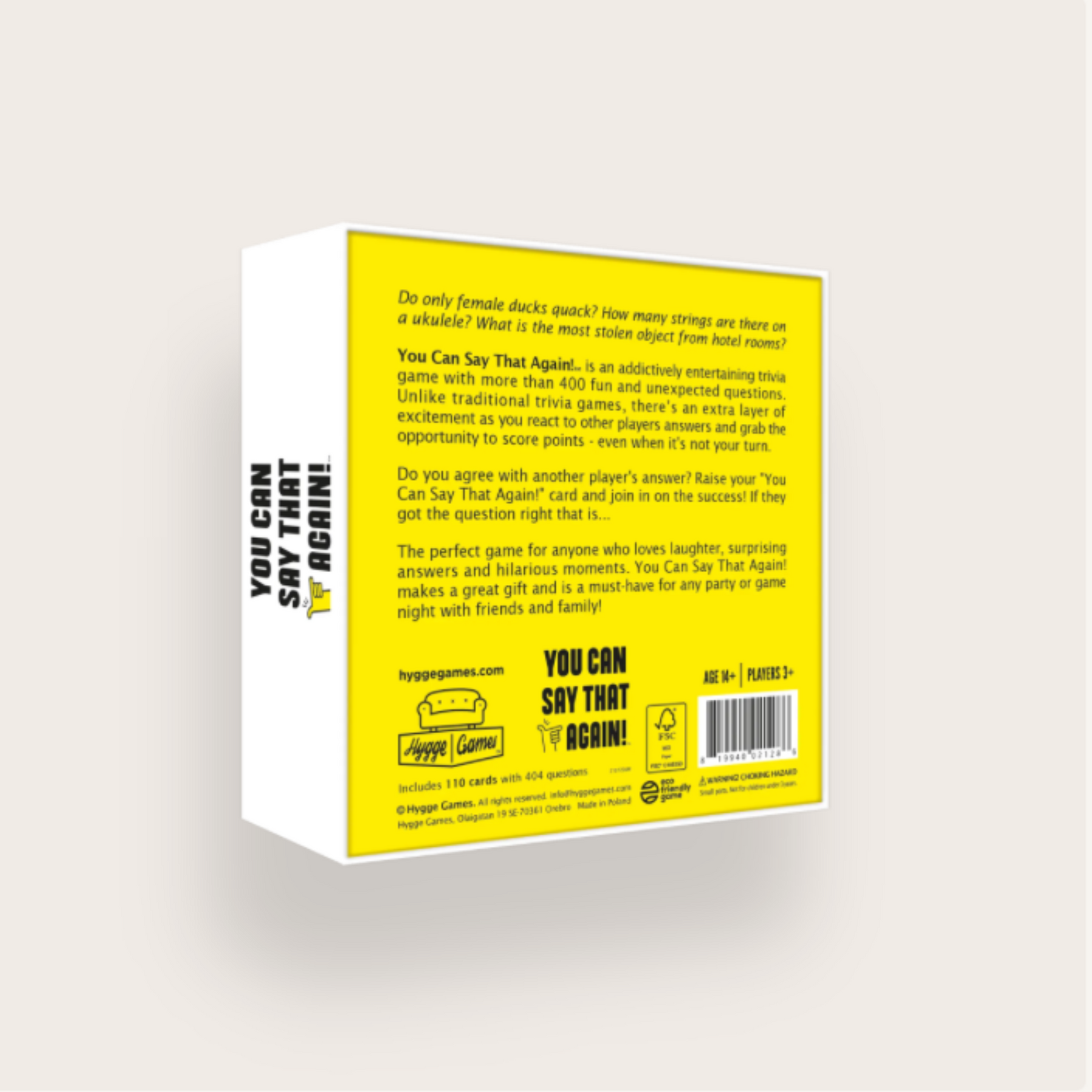 The perfect game for anyone who loves laughter, surprising answers and hilarious moments. You Can Say That Again! makes a great gift and is a must-have for any party or game night with friends and family!