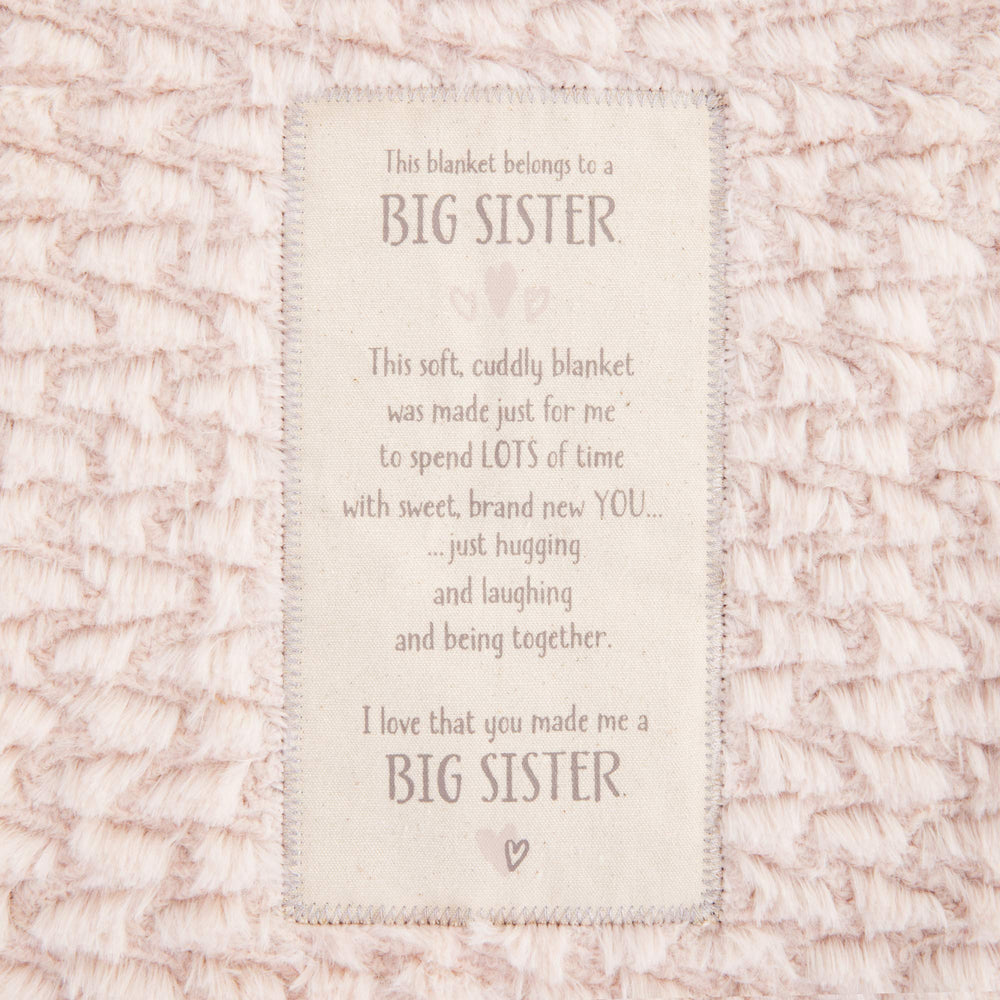- Snuggly, oversized blanket features a soft pink color with a sewn-in patch and sentiment about the joys of cuddling with your big sister