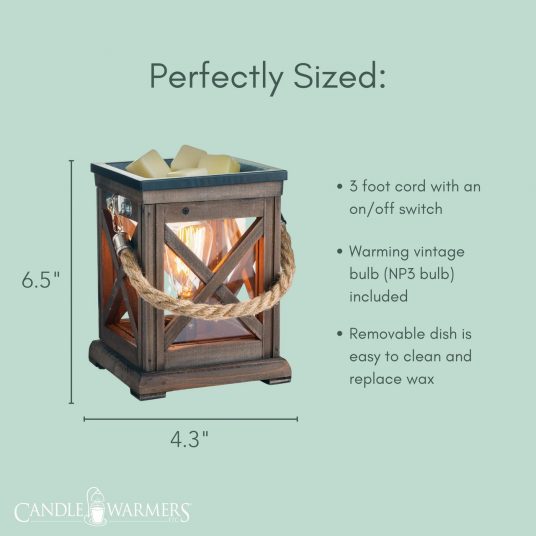 - INCLUDES: Warmer that measures 8.8"x4.6"x4.6" and NP3 Vintage Warming bulb. Cord is 3 ft long with dial switch for easy on/off. 1 Year limited warranty against factory defects.