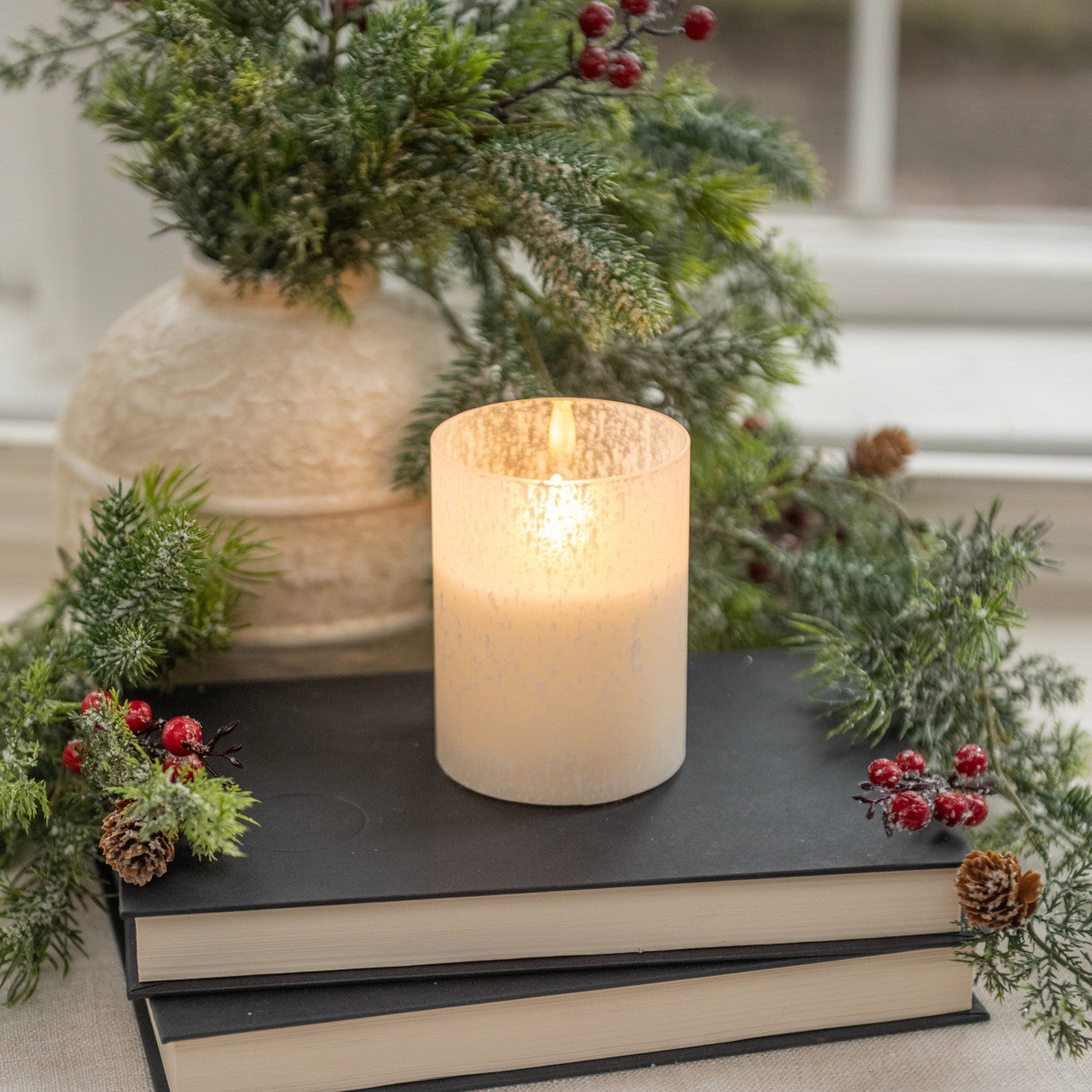 Illuminate your holiday space with the Snowy Glass Flame Candle. Encased in frosted glass that resembles a snowy winter scene, this candle casts a warm, flickering light perfect for cozy evenings. Its elegant design adds seasonal charm and creates a peaceful, festive atmosphere in any room.