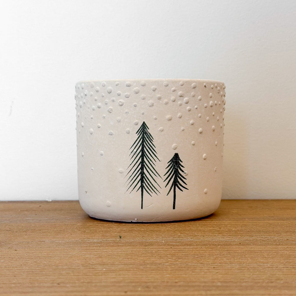 These ceramic planters feature a snowy textured design with simple evergreen tree accents, adding a cozy seasonal touch to your décor. Perfect for small plants, greenery, or as decorative pieces on shelves, mantels, or tabletops. Includes one large and one small planter.