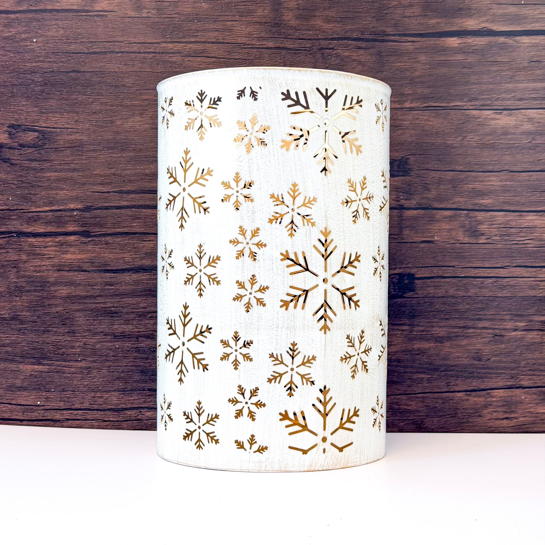 Each lantern features a distressed white finish with intricate snowflake cutouts that allow warm candlelight to glow through, casting beautiful patterns. Perfect for use with candles or LED lights, these lanterns bring a cozy and festive touch to mantels, tables, or entryway décor.