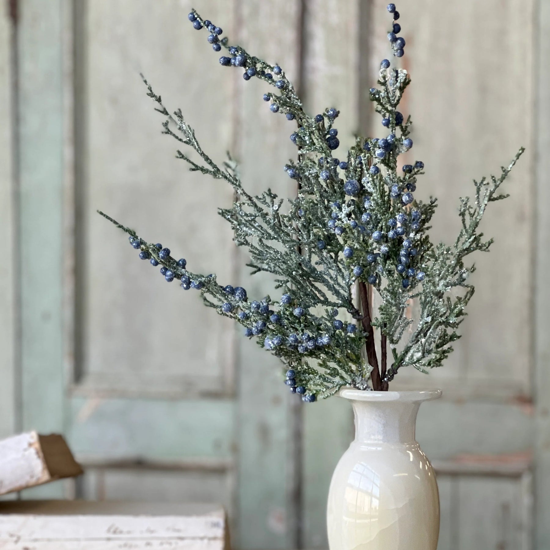 Structural juniper sprigs topped with heavy glitter and mica are adorned with a multitude of blue berries. Creates a collection perfect for winter long use!