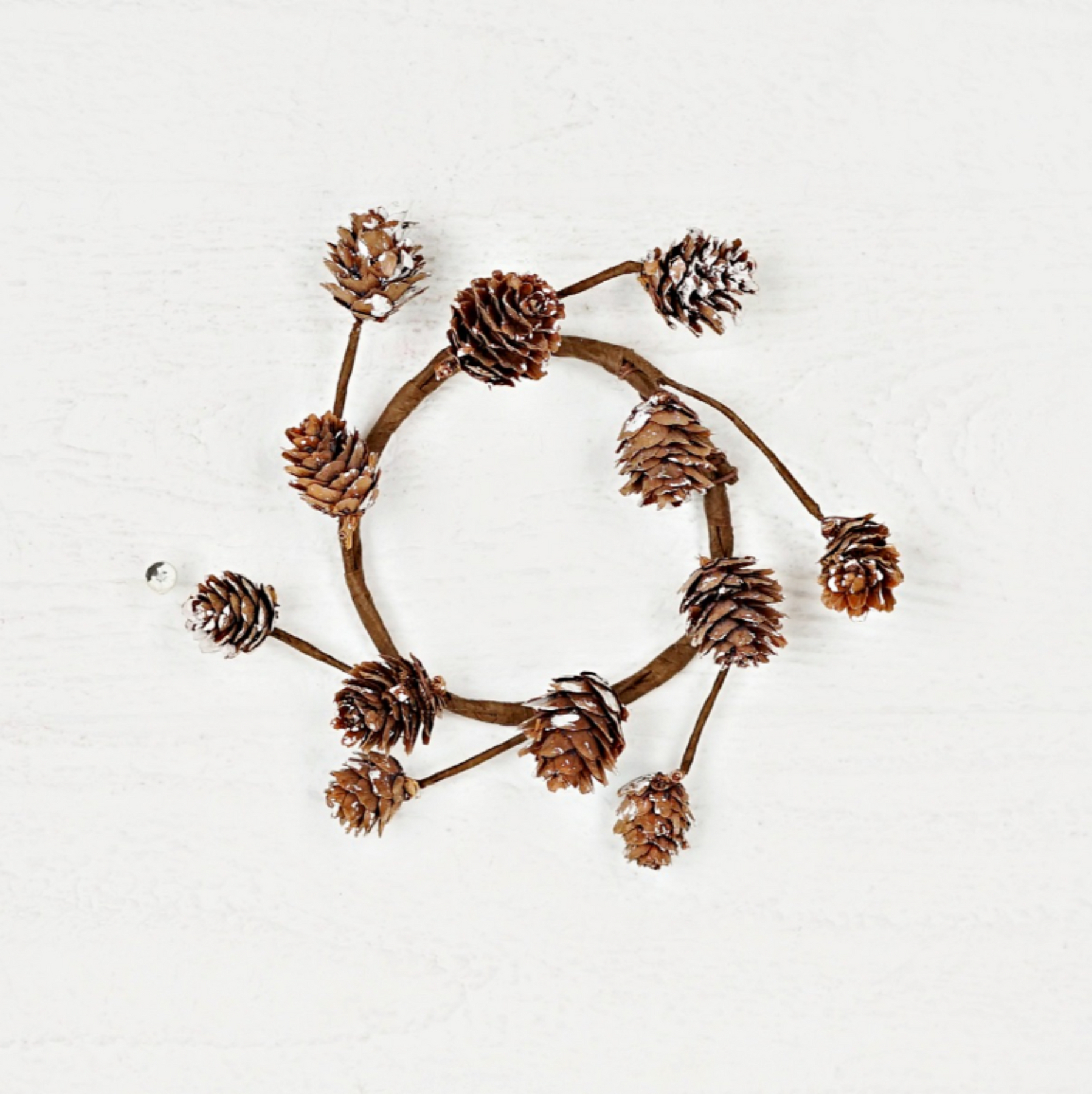 Create woodland warmth with this Flocked Natural Birch Cone Candle Ring. Featuring authentic birch cones dusted with soft faux snow, this nature-inspired accent brings forest elegance to your holiday décor.