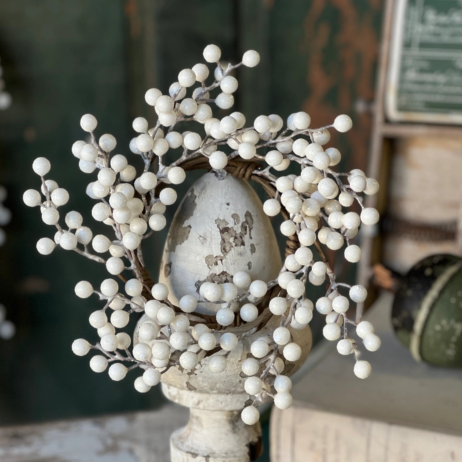 Alabaster colored berries with a sheen of glitter offer a beautiful neutral option for wintry displays.