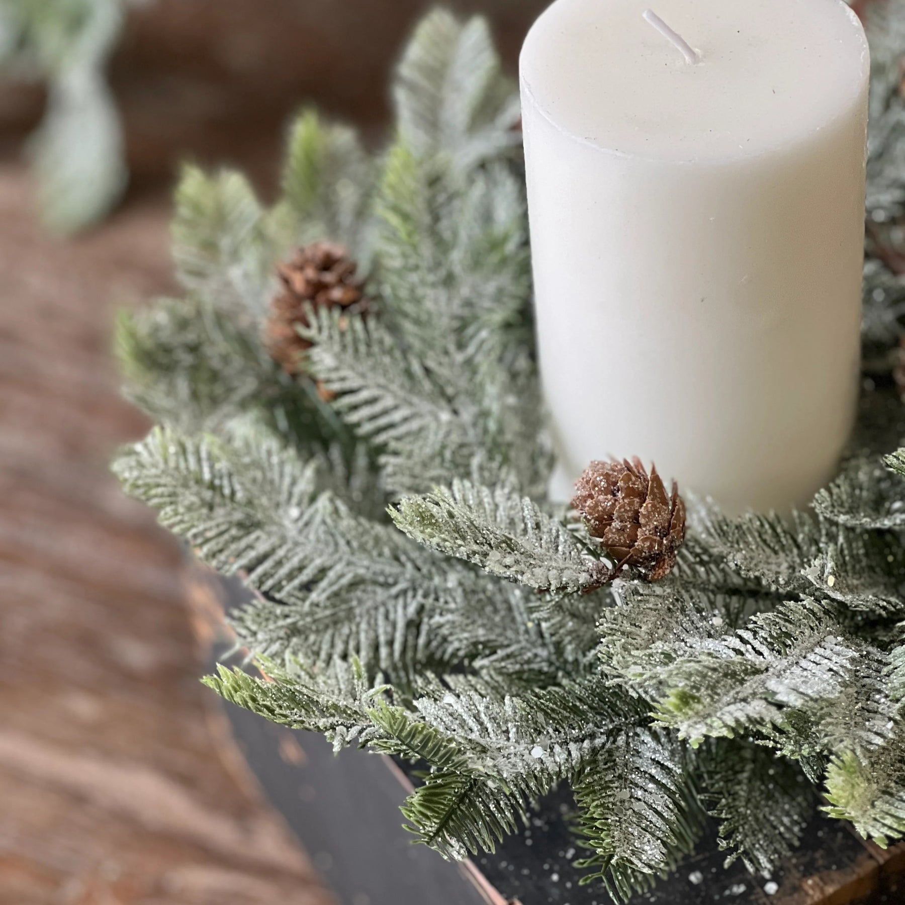 The Icy Wild Wilderness collection features structured hemlock foliage dashed with glitter and mica and small pine cones to compose a symphony of winter textures.