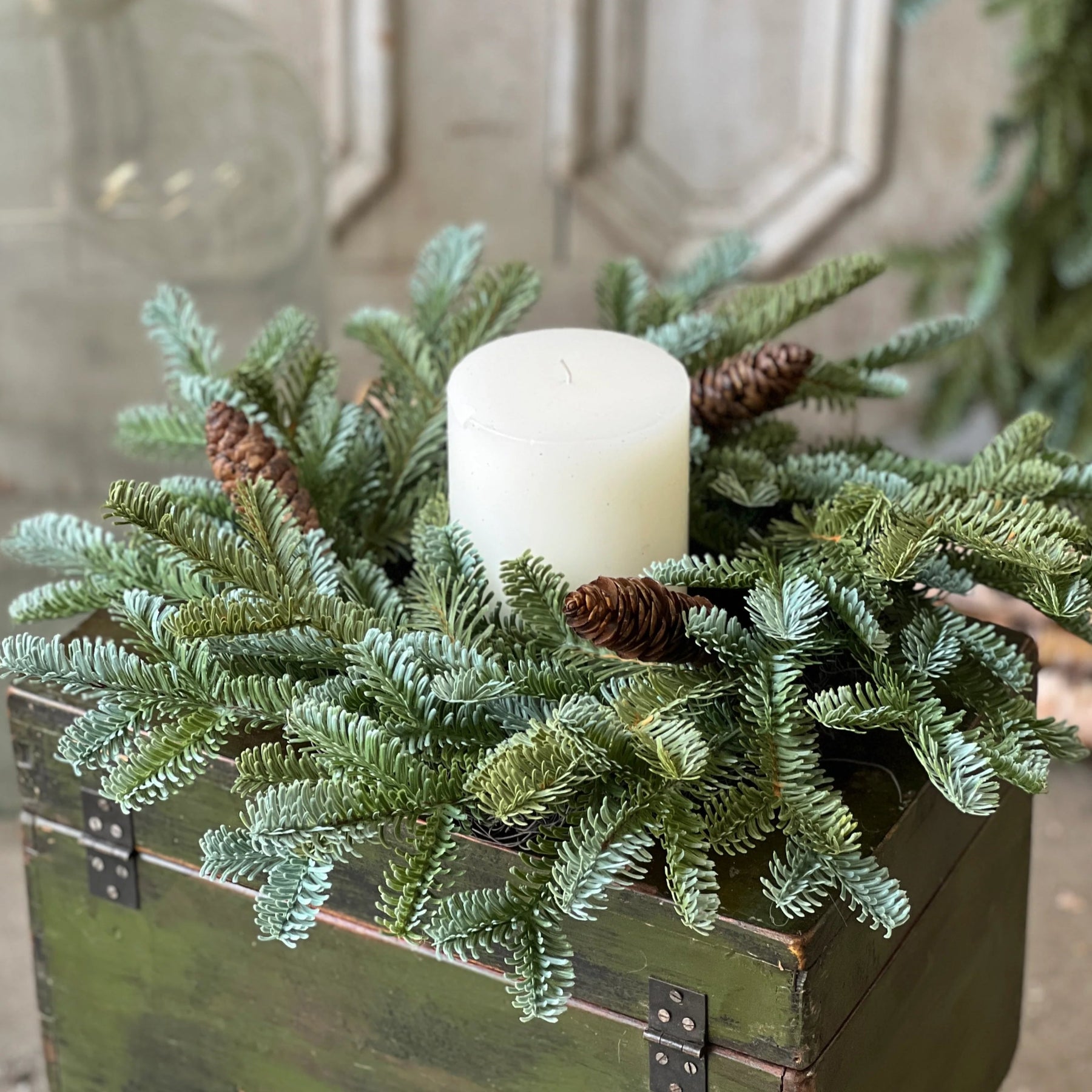 Gorgeously dense and textural, the Evergreen Tapestry collection is a work of art! Thick branches of tonal evergreen foliage in lovely shades of greens that edge into bluish shades are dashed with cones for extra flair.