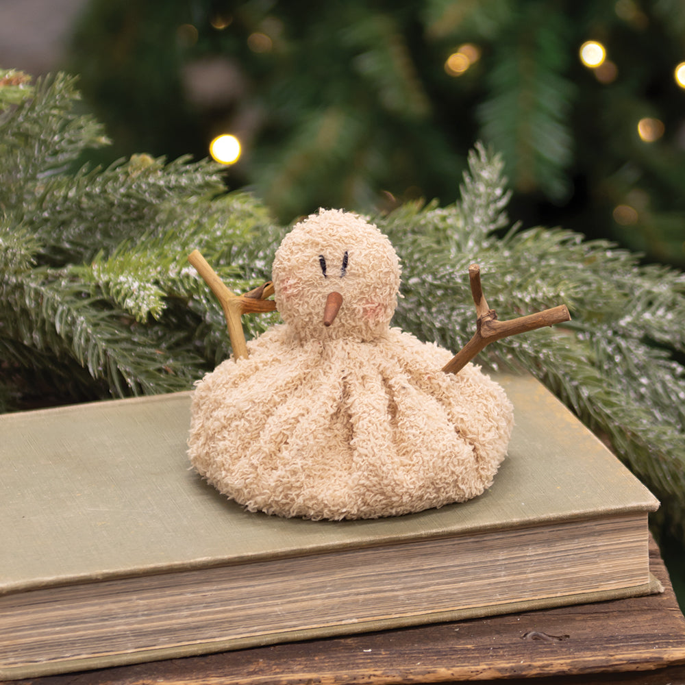 Our Baby Melting Snowman is made of textured fabric that is filled for a beanbag-style effect. This short, slouchy snowman has a wooden nose, rustic twig arms, and rosy cheeks. Perfect for adding a playful touch to a tabletop display of Winter decor.