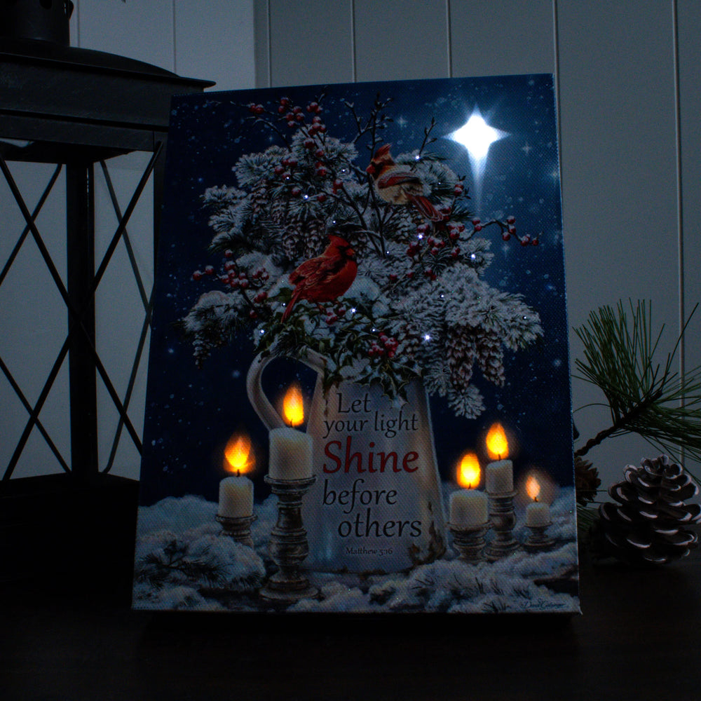 Create a warm and uplifting holiday atmosphere with Candle Light Christmas. This beautiful artwork by Dona Gelsinger features a rustic pitcher overflowing with snow-kissed pinecones, holly berries, and evergreen branches, creating a timeless winter arrangement. A vibrant red cardinal and a delicate chickadee perch gracefully among the foliage, adding a touch of life to the scene. Below, the inspiring words from Matthew 5:16, "Let your light shine before others," serve as a heartfelt reminder of faith and kindness during the season.