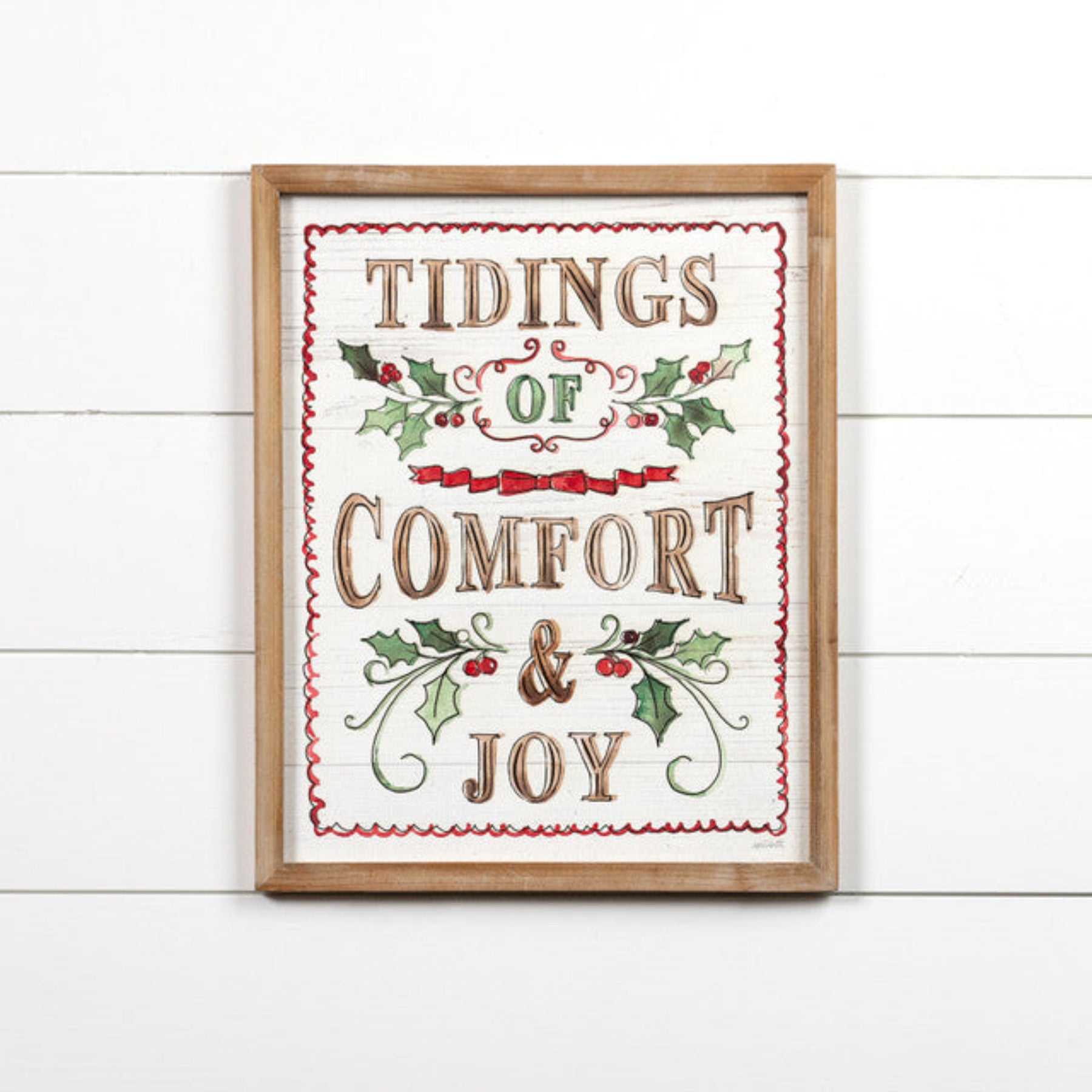 Celebrate the season with the Comfort & Joy Sign, featuring a warm wooden outline and elegant gold lettering against a crisp white background. Accented with subtle red details, this charming décor piece adds a festive touch that brings warmth and happiness to your holiday space.