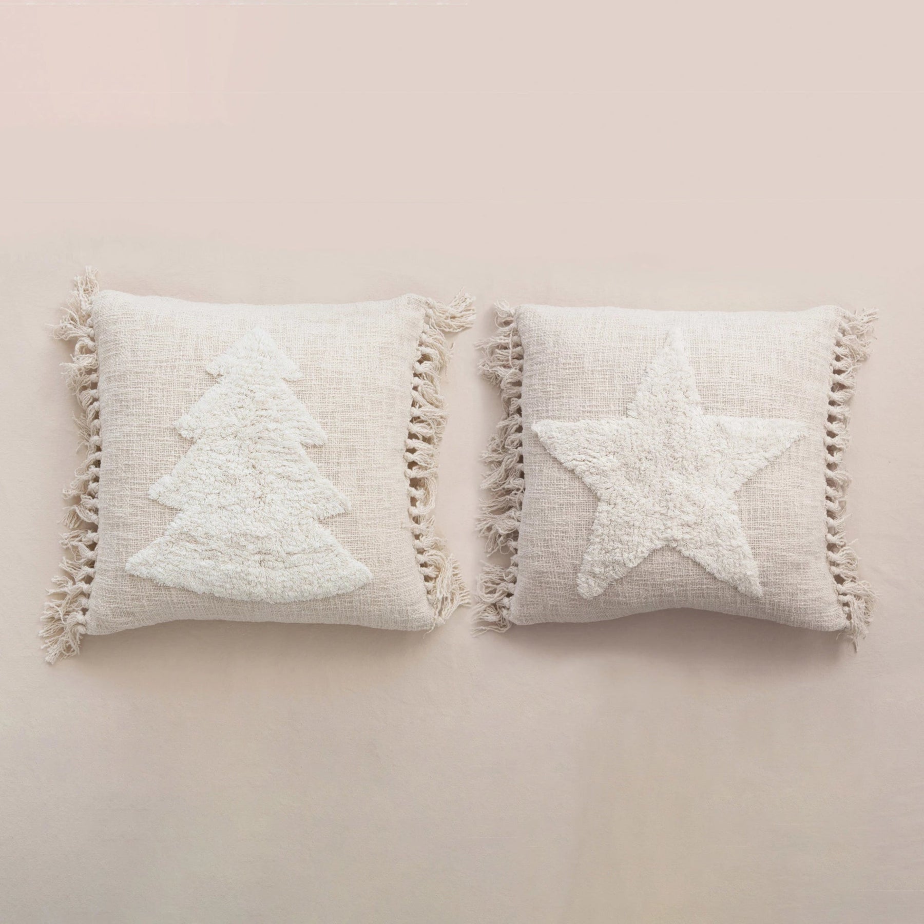 20" Square Cotton Blend Pillow w/ Tufted Tree/Star & Tassels, Cream Color, 2 Styles