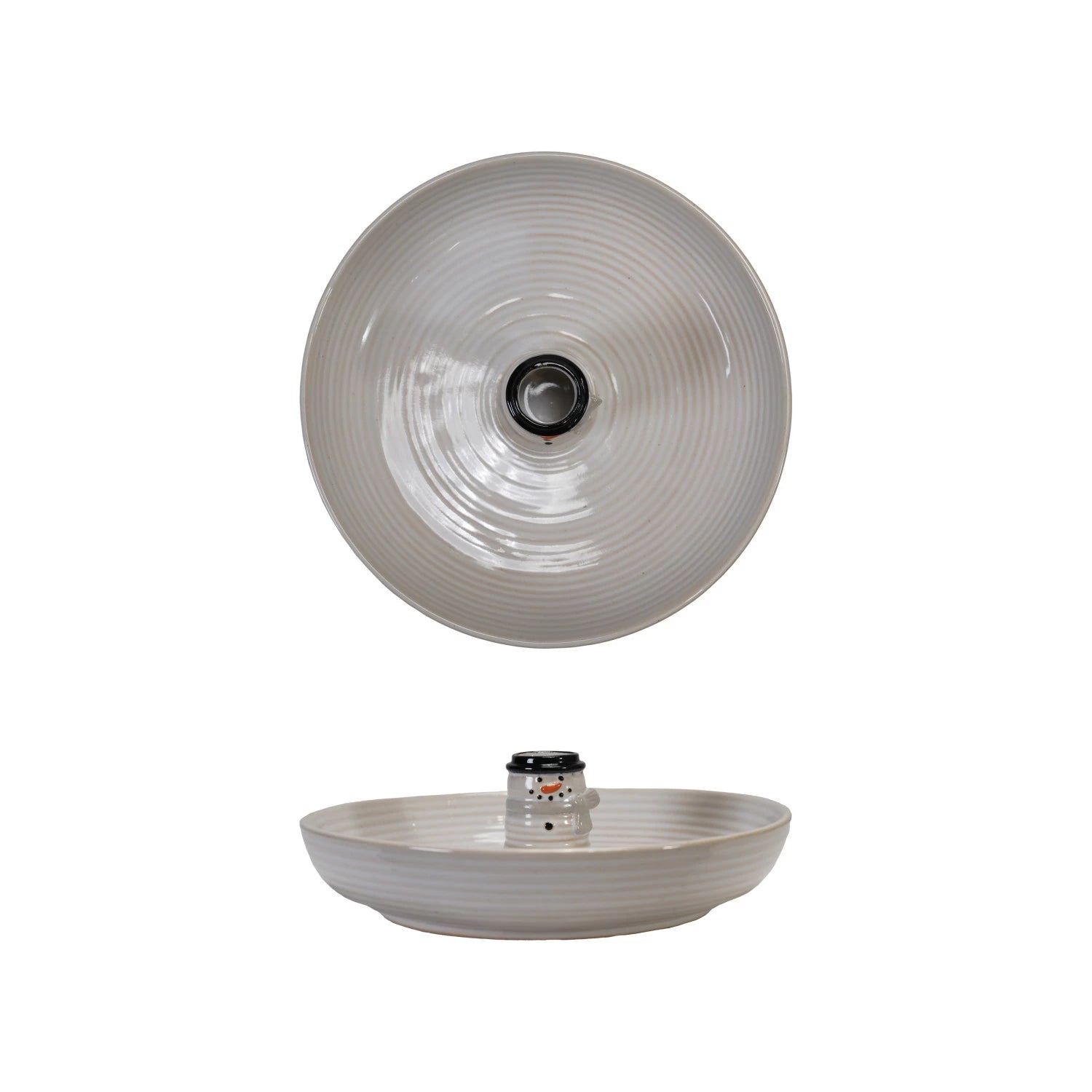 8-1/2" Round x 2-3/4"H Stoneware Ribbed Bowl w/ Snowman Shaped Toothpick Holder Inside, Reactive Glaze, White & Black (Each One Will Vary)