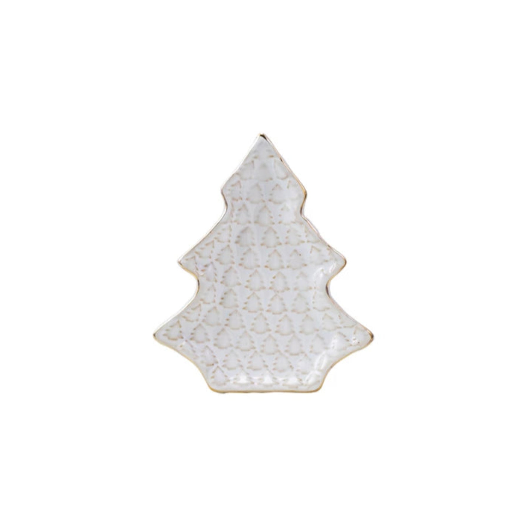 6"L x 5"W Stoneware Tree Shaped Plate w/ Trees & Gold Electroplating, Reactive Glaze, White (Each One Will Vary)