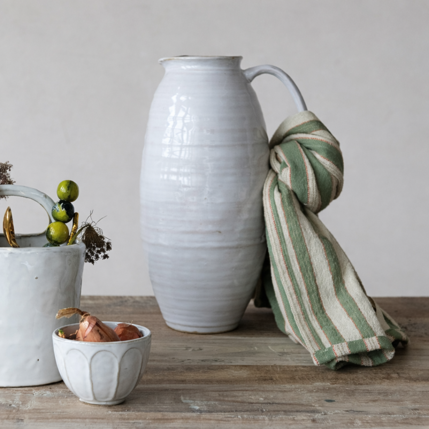 Simple and timeless, this tall stoneware pitcher features a softly rounded silhouette and a beautiful reactive glaze finish that gives each piece its own subtle character. Perfect for serving drinks at the table or displaying fresh stems, it brings an easy, organic elegance to everyday moments.