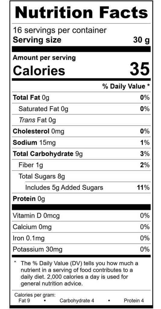 Apples (apples, salt, calcium chloride), sugar, red bell peppers, apple cider vinegar, jalapeno peppers, onions, lemon juice from concentrate (filtered water, lemon juice concentrate), food starch-modified, filtered water, minced dried garlic, Riesling wine (contains sulfites), molasses, sea salt, oregano, cayenne.