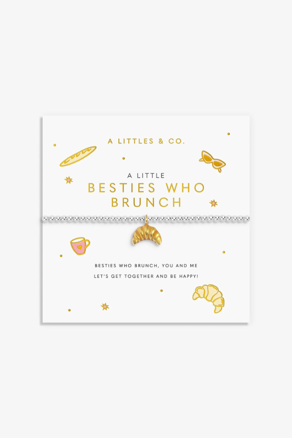Say hello to the A Little Vibes Collection. Beautifully beaded and crowned with a mini croissant charm, the A Little Vibes 'Besties Who Brunch' Bracelet in Silver Plating is wrapped around a colorful stylized card, illustrated with adorable matching motifs.