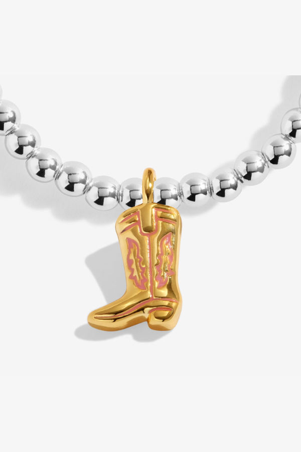 Say hello to the A Little Vibes Collection. Beautifully beaded and crowned with a mini cowgirl boot charm, the A Little Vibes 'Yeehaw' Bracelet in Silver Plating is wrapped around a colorful stylized card, illustrated with adorable matching motifs.