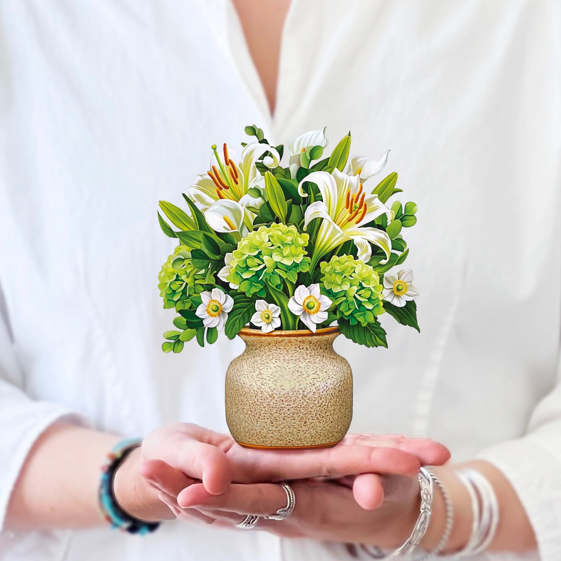 - Includes: bouquet, matching bouquet note card, paper vase and vibrant mailing envelope