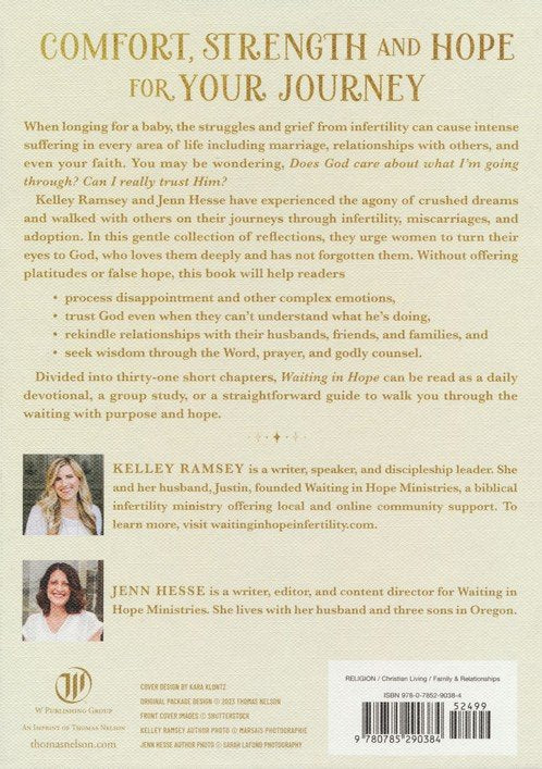 As seasoned infertility ministry leaders, Jenn Hesse and Kelley Ramsey have committed to help women turn to Jesus as their hope in sorrow. This book is the resource they wish they'd had ten years ago in the middle of their infertility grief. Women need to hear the good news that Jesus is with them in their wait, and that they can live a life of purpose regardless of how their wait ends.
