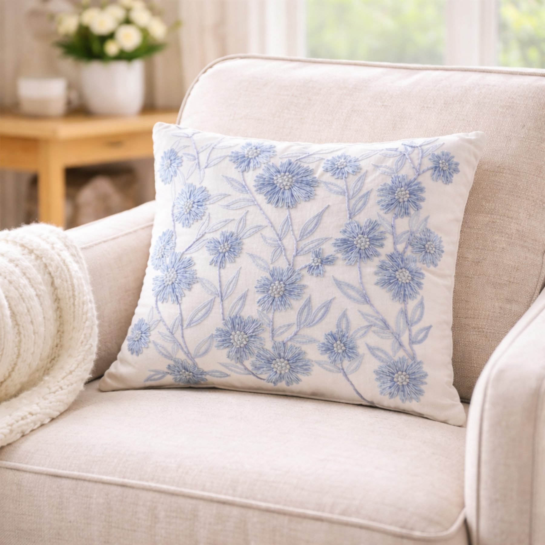 Light, airy, and beautifully detailed. This floral accent pillow brings a soft touch of blue to your space. The embroidered blooms and leafy vines add texture and charm, making it a perfect piece for layering on a sofa, bed, or reading chair. A timeless design that feels fresh, calm, and inviting.