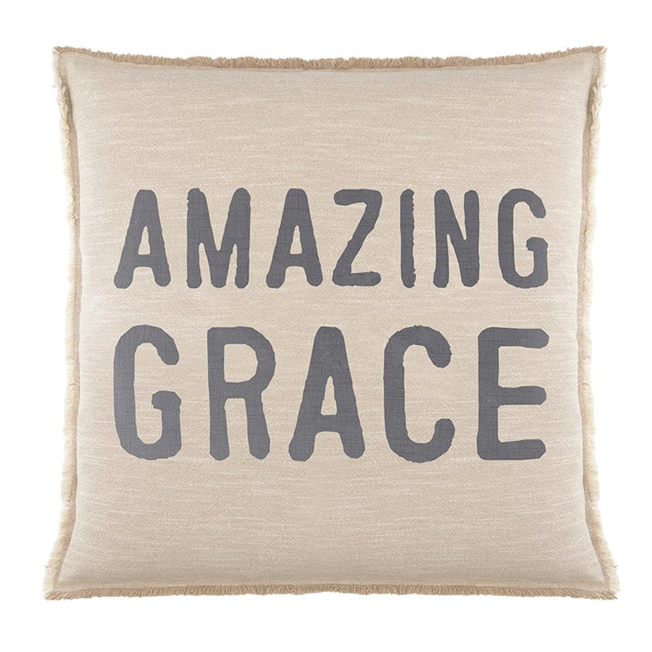 Two pillows with 'Amazing Grace' and 'Blessed' text on a white surface.