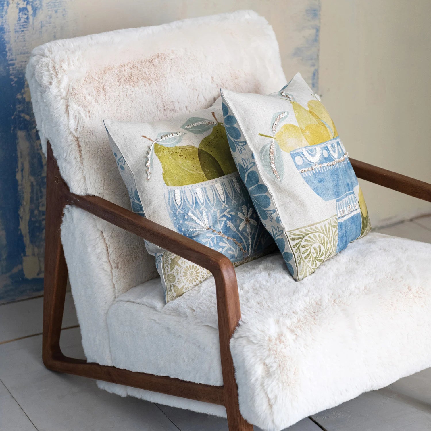 Bring a touch of rustic charm and artistic flair to your home with this beautifully detailed throw pillow. Featuring a soft, hand-painted–style illustration of green pears nestled inside a decorative blue bowl, this design is enhanced with dimensional embroidered accents that add texture and craftsmanship to every stitch. The subtle neutral background and patterned green border along the bottom give the piece a warm, vintage-inspired appeal.