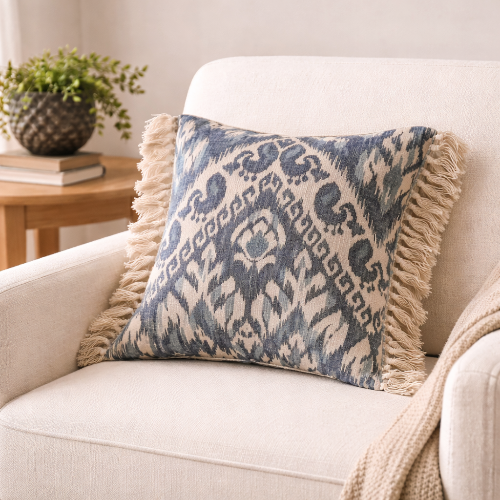 Add global-inspired style and cozy texture to your space with this beautiful blue ikat accent pillow. Featuring a soft woven fabric in a classic ikat pattern and finished with playful fringe trim on both sides, this pillow brings the perfect mix of relaxed and elevated design. The deep blue and neutral tones make it easy to style on sofas, beds, or accent chairs for an instant refresh.