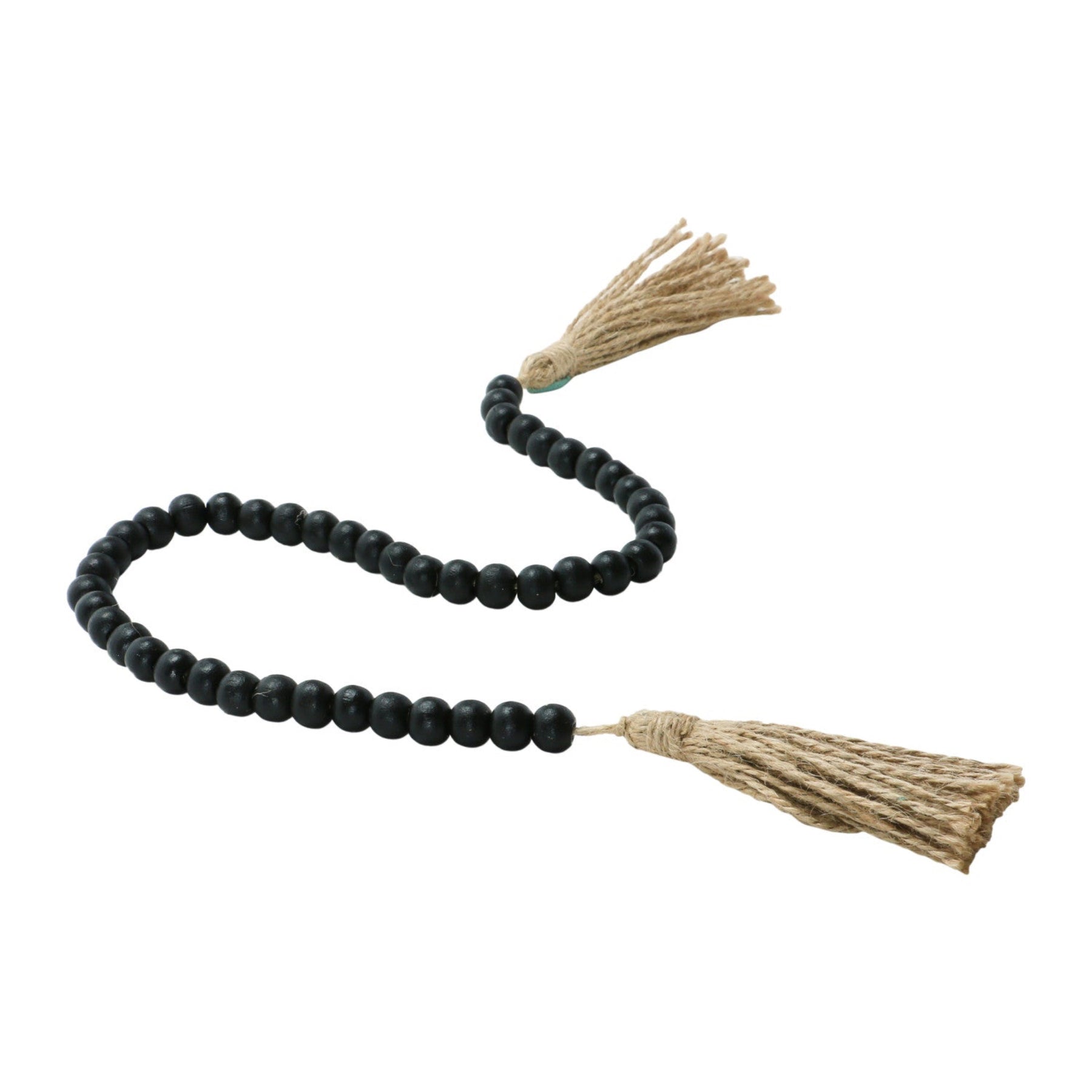Add the perfect finishing touch to your home styling with this black wood bead garland, accented with rustic jute tassels on each end. Designed to drape beautifully over trays, bowls, coffee table stacks, or styled shelves, this piece brings a warm mix of modern farmhouse and natural texture to any space. The matte black beads add contrast while the neutral tassels keep the look soft and organic.