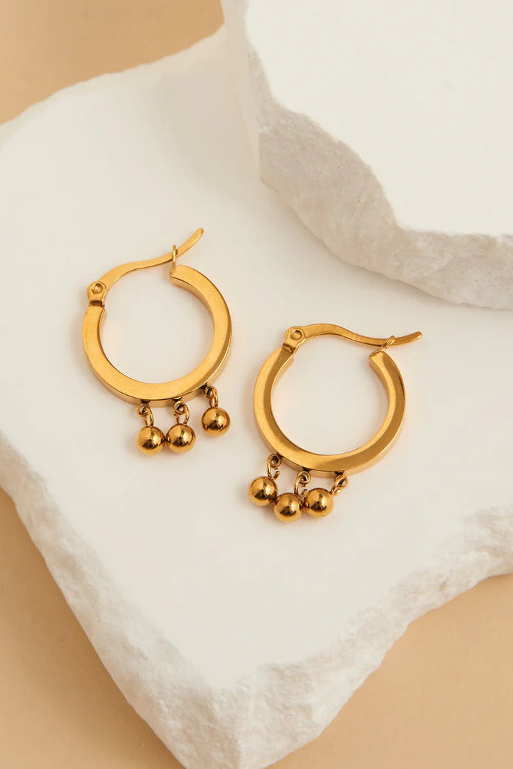 Featuring a sleek huggie hoop design accented by a delicate ball drop charm, these earrings bring the perfect balance of minimalism and movement. Made with stainless steel plating, they are built to withstand water, sweat, and daily wear without tarnishing or fading.
