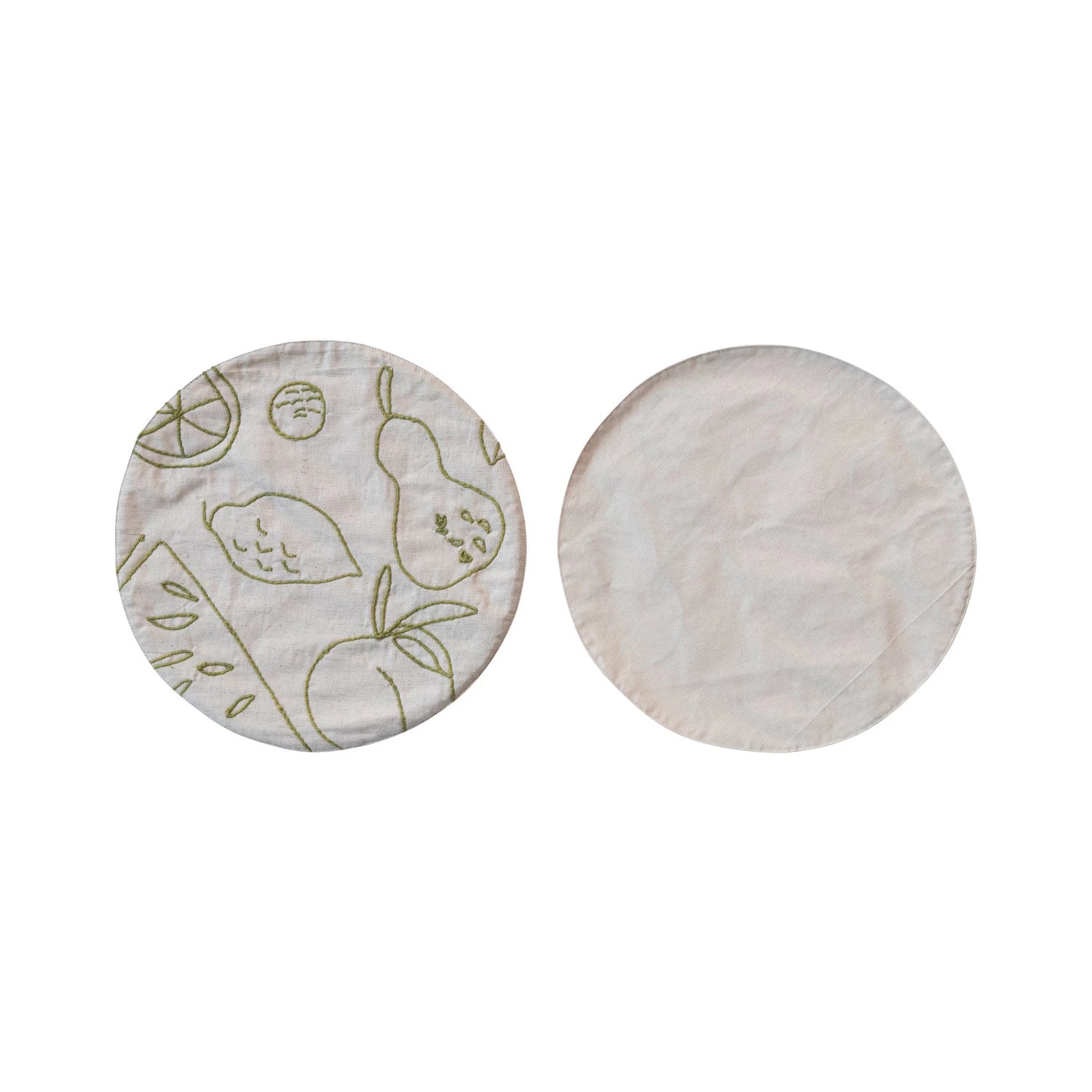This fruit-themed placemat is a practical and aesthetic addition to any dining area. Made from soft cotton and durable linen, it features a charming round shape with intricate embroidery of fruits in a natural and vibrant green hues.