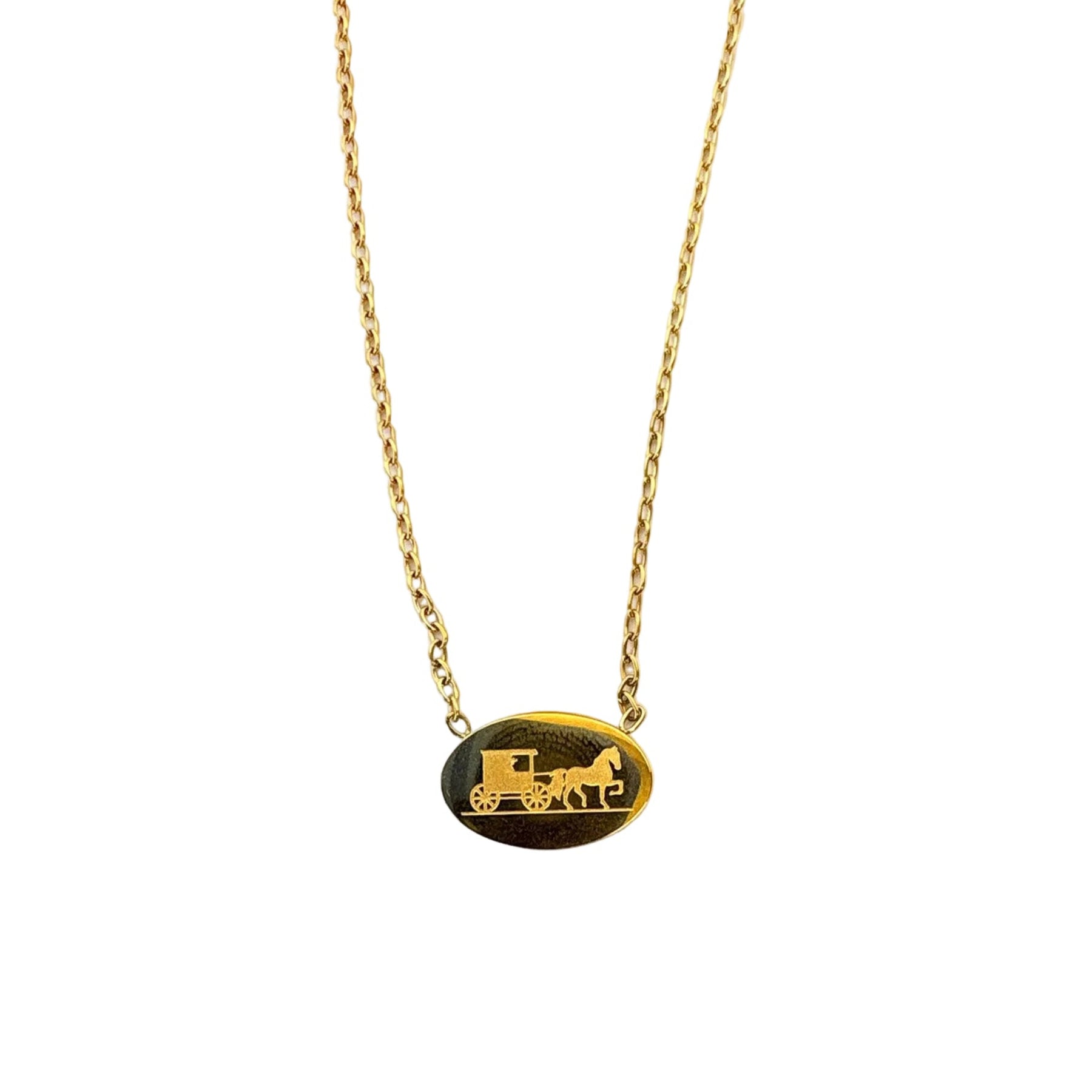 A timeless piece with a touch of nostalgic charm, this delicate necklace features a beautifully detailed horse and buggy motif set against a rich, dark backdrop. The warm gold finish adds an elegant glow, making it a meaningful accessory for everyday wear or special occasions.