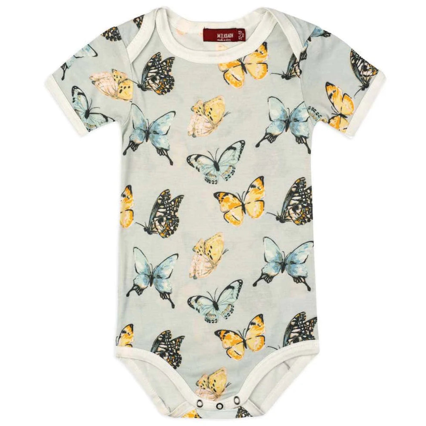 Our soft and soothing baby Bamboo One Piece in the Butterfly print merges understated form and functionality. The envelope neckline and ring-snap closures allow for effortless, one-handed undressing of your little one. The contrasting edging highlights the structure and fabric design. Complete your little one's ensemble by pairing this One Piece with other Milkbarn treasures.