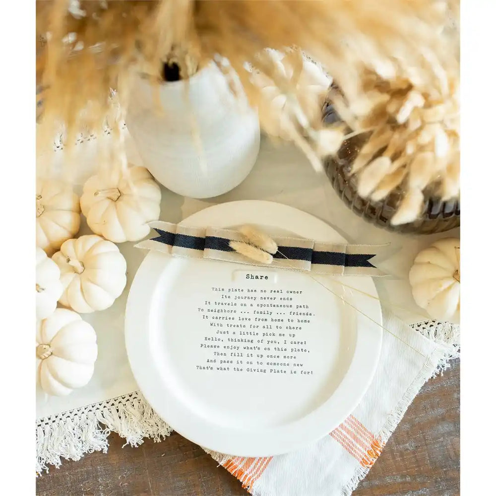 Stoneware round platter with debossed poem explaining the journey of sharing the platter. The gift that keeps on giving!
