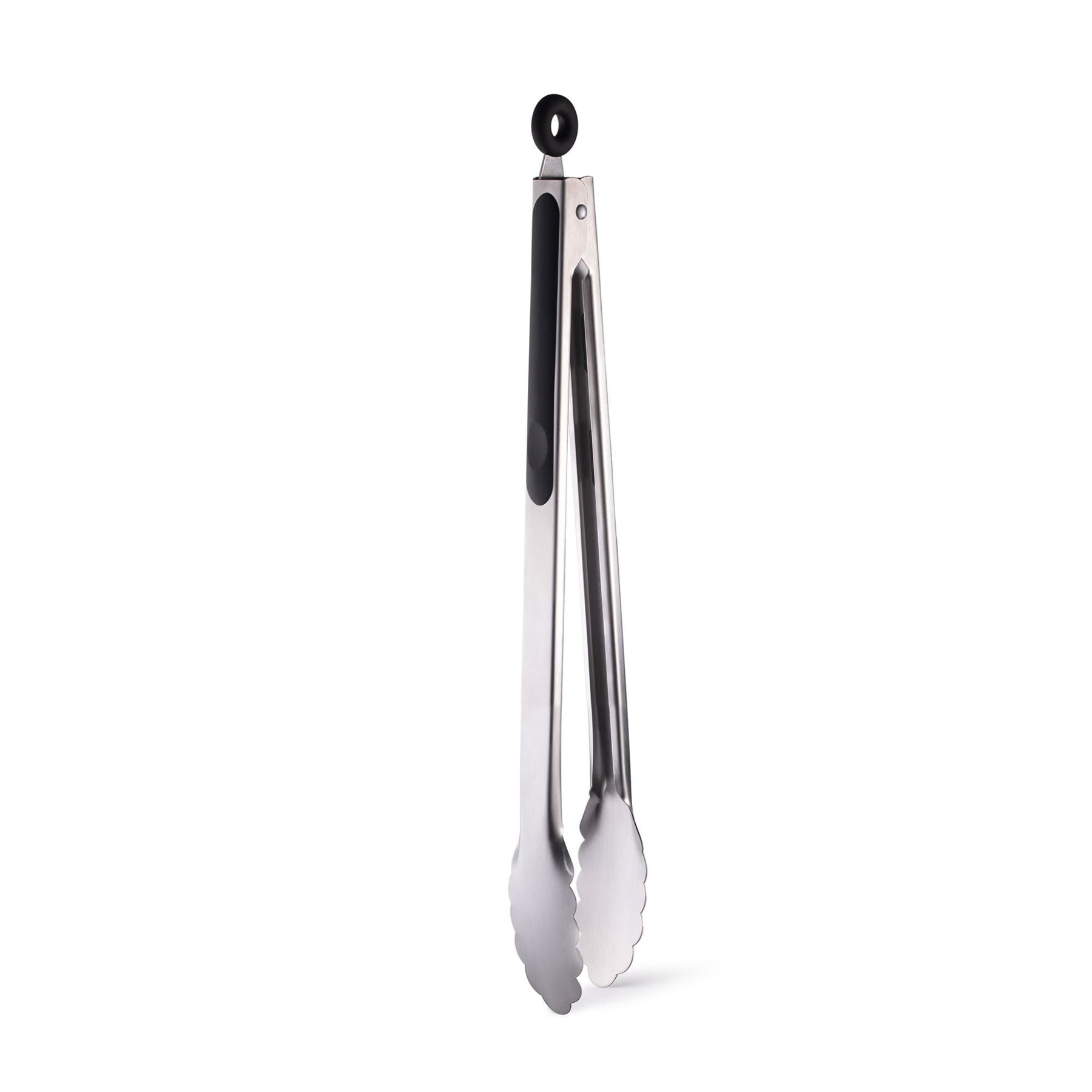 • Effortless One-Hand Operation: Scalloped blades hold food securely and drain liquids; spring action reopens blades; pull ring locks tongs closed
