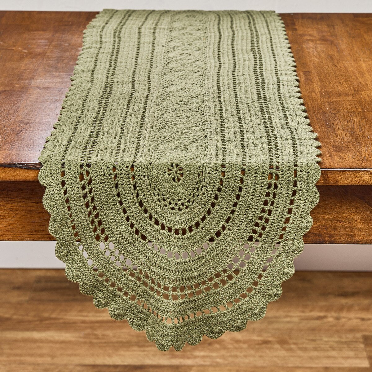 Add texture and timeless charm to your table with this beautifully detailed crochet runner. Its intricate pattern and soft olive tone create a warm, inviting look that pairs effortlessly with both rustic and classic décor.