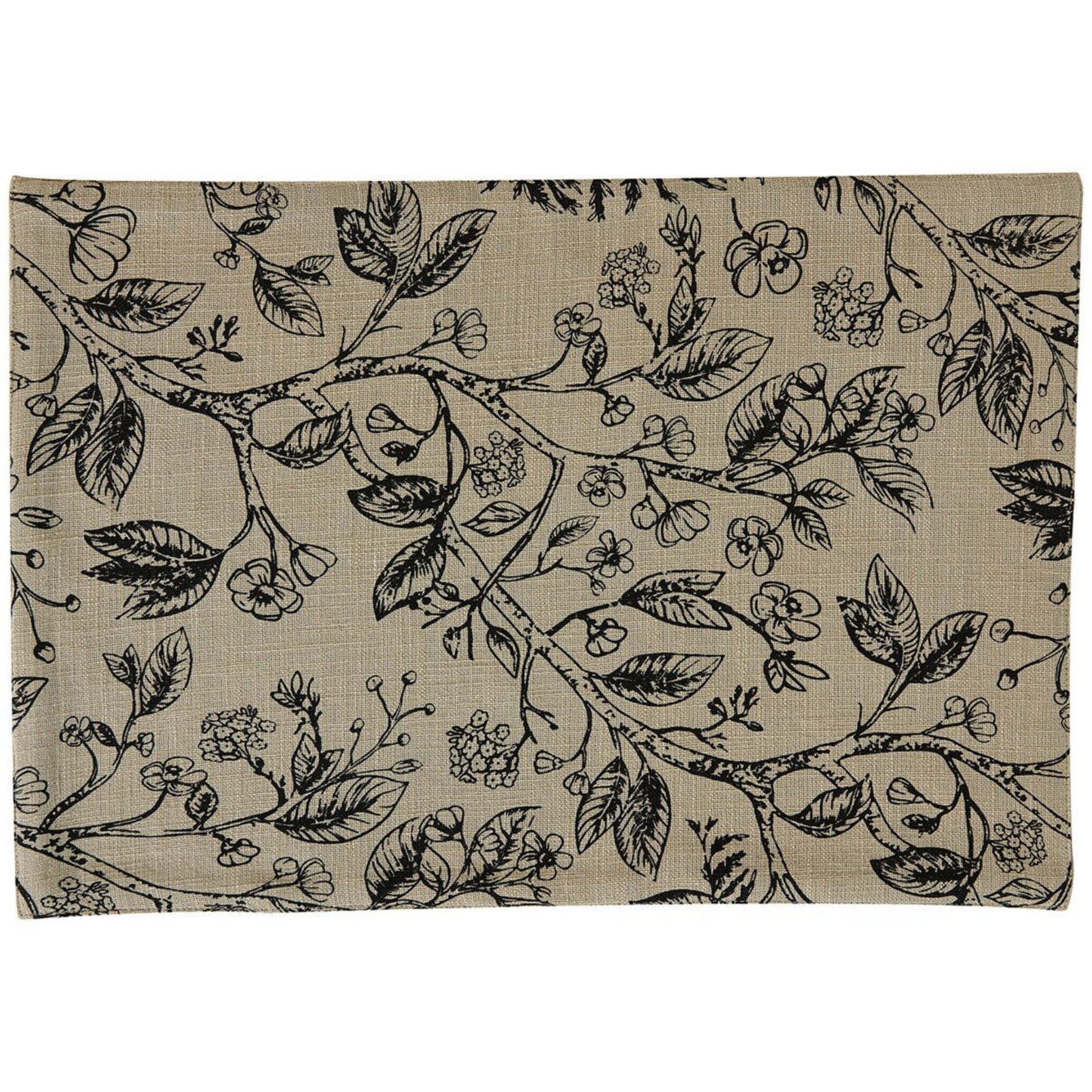 Graceful branches and delicate blossoms create a refined, nature-inspired accent for the table. The Darby placemat features an elegant black botanical print set against a warm natural background, offering a timeless look that blends beautifully with farmhouse, cottage, or classic décor. Its soft neutral palette adds subtle pattern and charm to everyday meals or special gatherings.