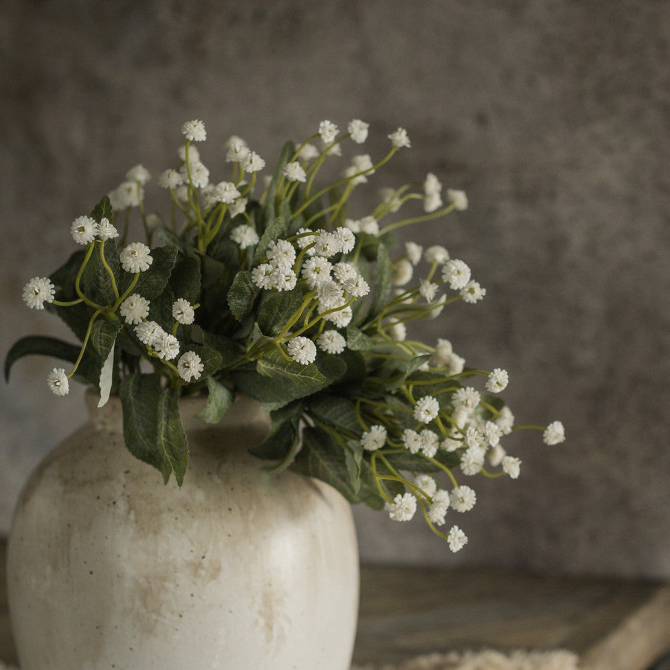 Delicate and timeless, this mini star bundle brings a soft, natural touch to any space. Featuring tiny white blossoms paired with layered green leaves, this arrangement offers the charm of freshly gathered florals without the upkeep. The stems are neatly wrapped for a simple, rustic finish that works beautifully in vases, baskets, or styled flat as part of a decorative display.