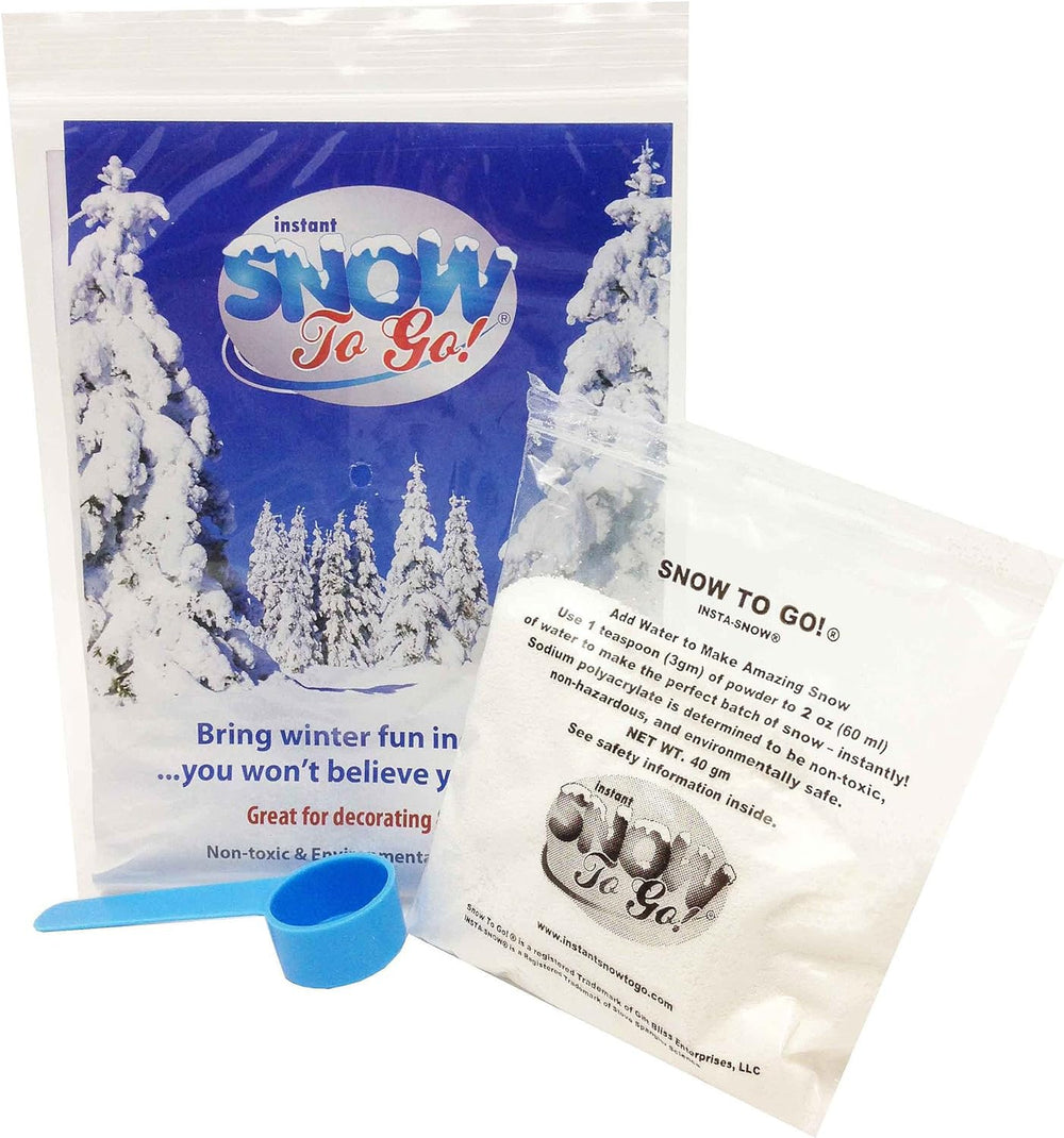 Poly Pack of Instant Snow To Go Plenty of snow powder to make a centerpiece for your holiday table, or magical fun for the kids and guests. Watch the instant transformation of water and Snow To Go powder into artificial snow which looks and feels like soft fluffy real snow. There's no mixing, just amazement!