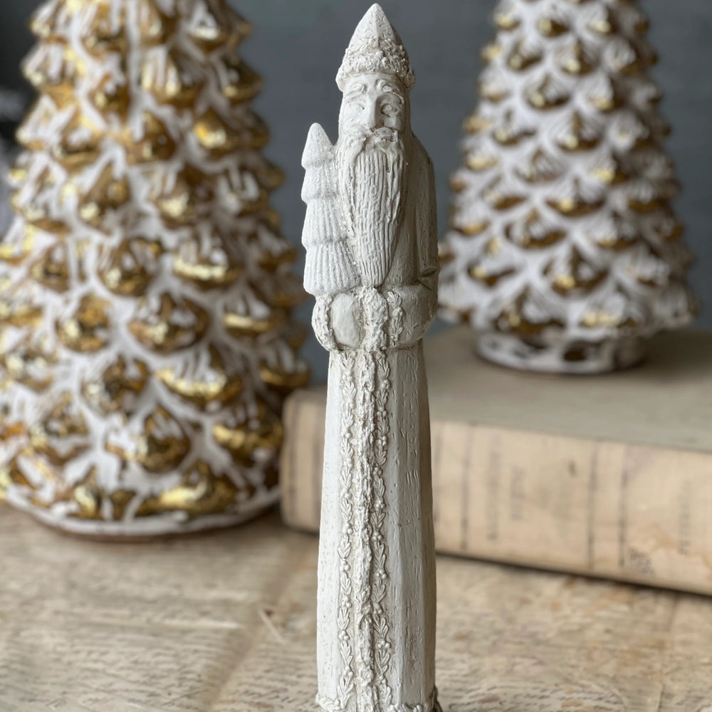 The Shining Slim Santa adds a unique aspect of height to displays. These distressed blow-mold Santa's in their detailed robes tote a glittering tree are sure to charm onlookers.