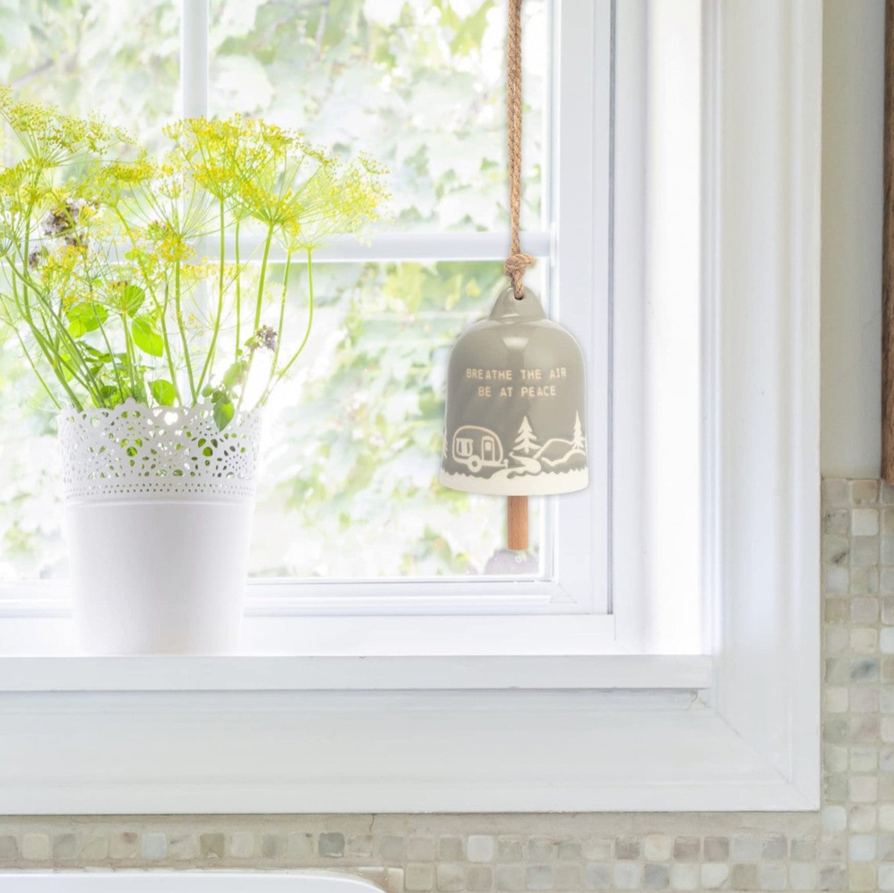 Add a cozy, peaceful touch to your space with this charming hanging bell ornament. Featuring a soft neutral glaze, rustic rope hanger, and sweet scenic design, it’s the perfect accent for a tree, garland, hook, or seasonal display. A simple piece that brings warmth and calm wherever it’s styled.