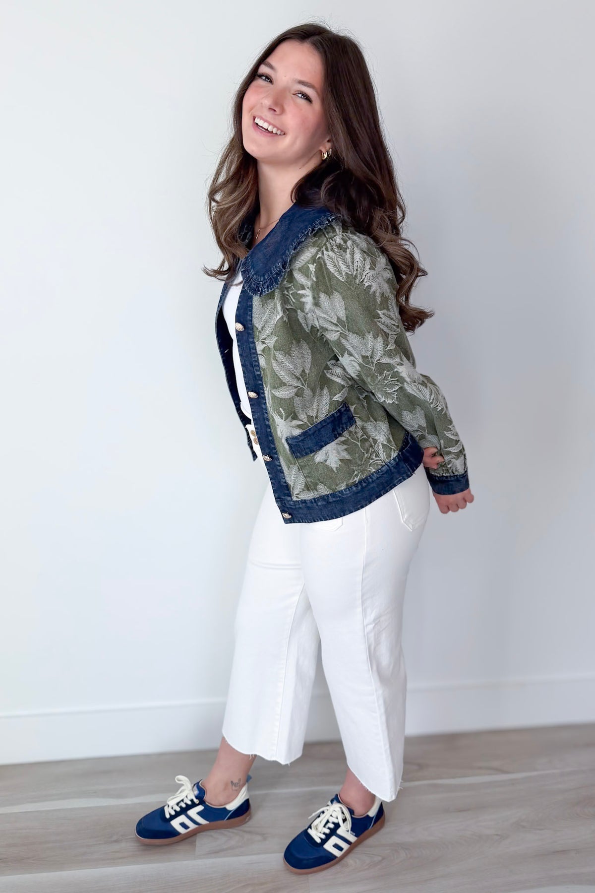 • Dark denim contrast collar and trim
