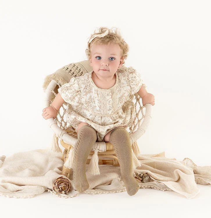 The Elodie romper blends timeless charm with vintage-inspired elegance, thoughtfully crafted from triple-layered 100% cotton muslin for exceptional softness and breathability. Featuring a neutral floral print, delicate lace trim, functional front buttons, and convenient snap closures for easy diaper changes, it offers both beauty and practicality. Ideal for spring, summer, or fall, the romper includes a matching bow and pairs effortlessly with optional knee-high socks and a cozy cardigan for a complete look.