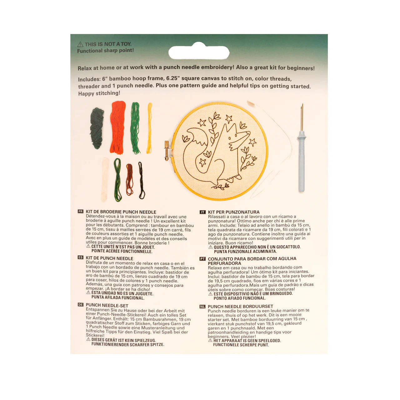 Kit comes with everything needed including: 1 adjustable bamboo hoop, 1 punch needle, 1 needle threader, 1 cotton cloth with printed template, and plenty of yarn to complete the design.