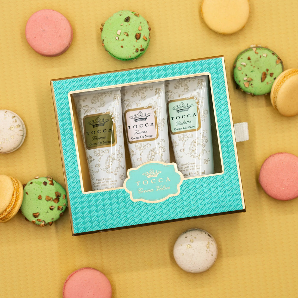 A trio of luxurious hand creams is tucked into this unique windowed keepsake box—the perfect springtime indulgence and ideal anytime gift. Hands become enveloped in a rich cream with nourishing coconut oil and shea butter infused with three iconic TOCCA scents.