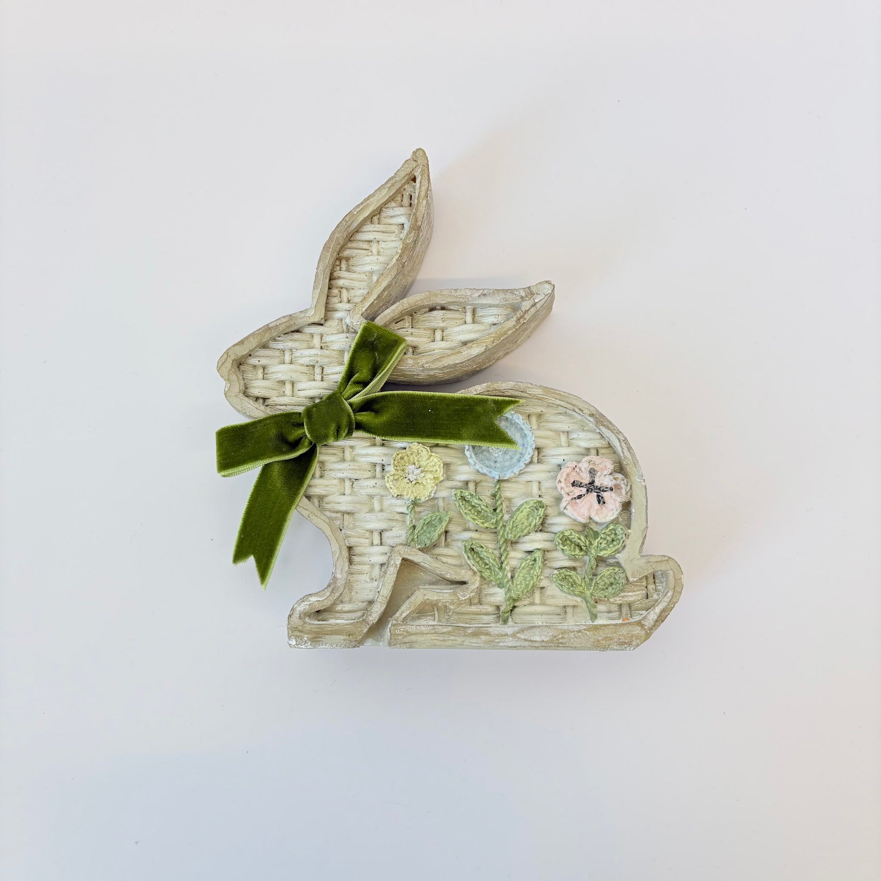 Charming and handcrafted in feel, this wicker-style bunny brings storybook sweetness to your spring décor. The woven texture is framed with softly distressed edges and accented with delicate floral details, while a rich velvet bow adds a touch of vintage-inspired elegance. Perfect for layering on mantels, tabletops, or tucked into an Easter vignette.
