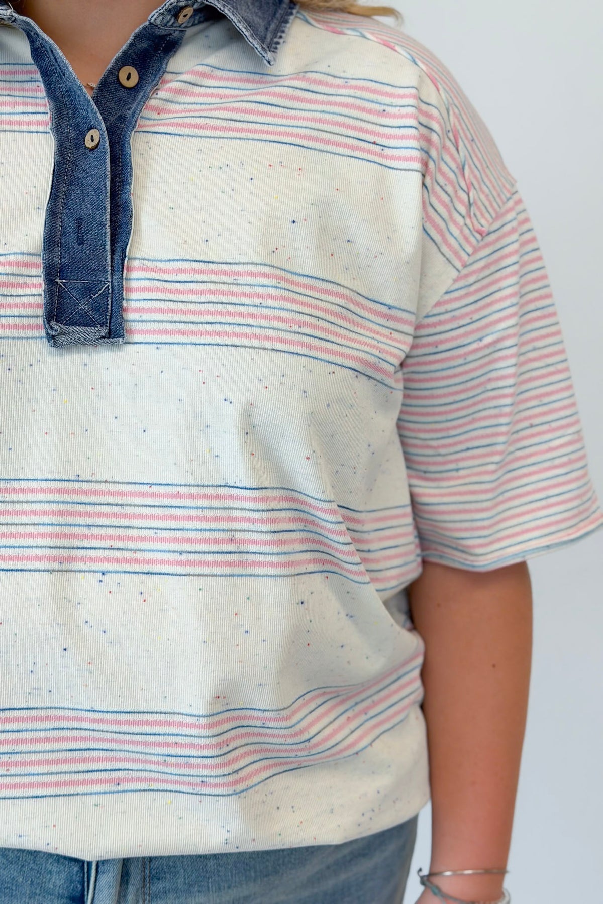 • Contrast denim collar with button placket
