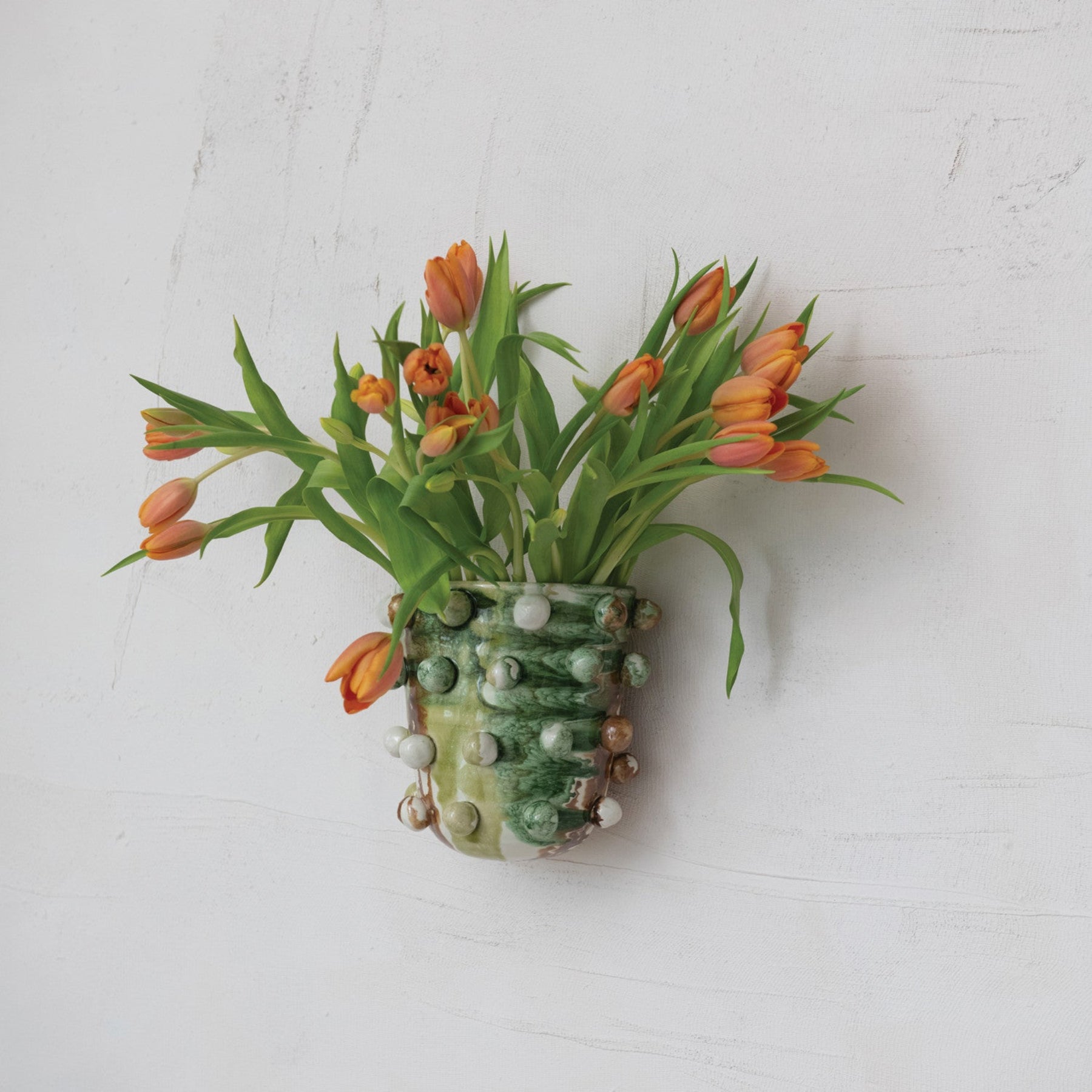 Add a little personality to your wall with this charming terra-cotta planter, finished in a beautifully mottled reactive glaze. The raised ball detail gives it a playful, sculptural look while still feeling earthy and elevated. Perfect for fresh blooms, dried stems, or a trailing plant to brighten up any corner.