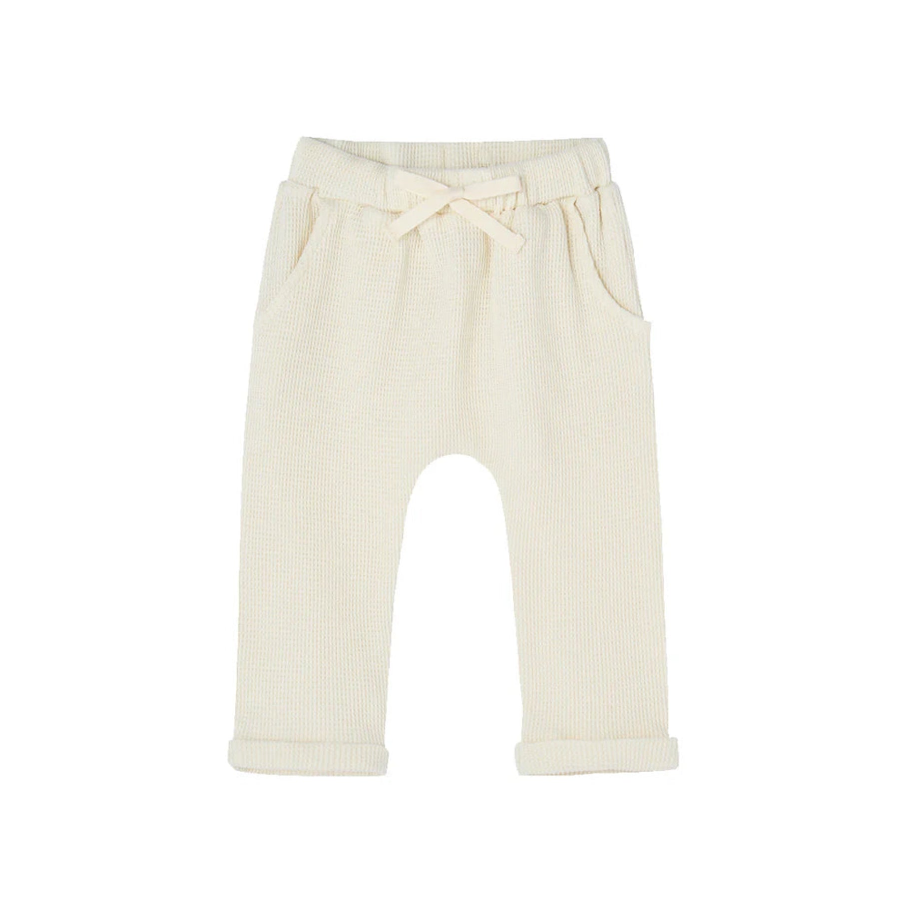 Whether swinging at the park or listening to a favorite fable, we add relaxed comfort to your little one’s playtime and lounge time in our everyday baby Vanilla Waffle Jogger Pants. Our durable Jogger Pants include an elastic waistband with a cotton drawstring, side pockets, and a rolled cuff hem.